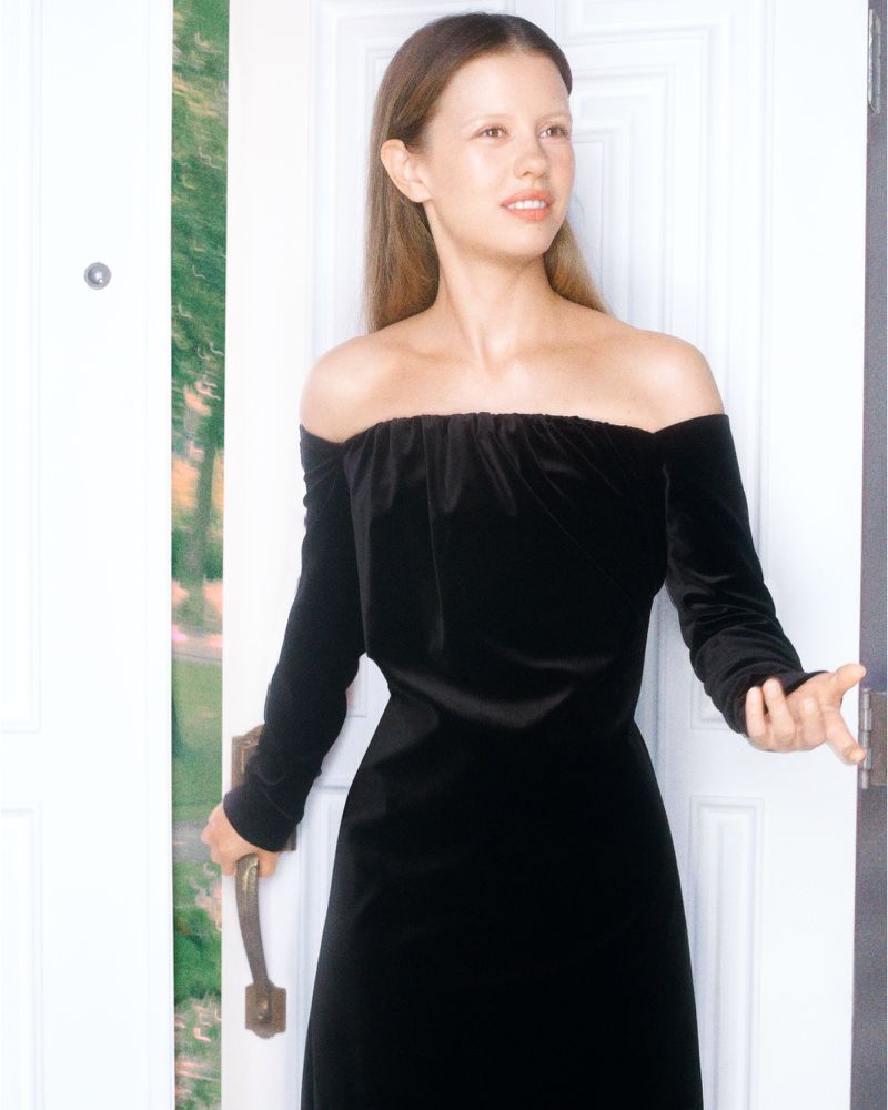 - El Look: Un vestido de terciopelo negro con escote off-the-shoulder. Es elegancia pura, pero la iluminación suave y la pose de «acción» le quitan lo estático y le dan un aire de misterio.