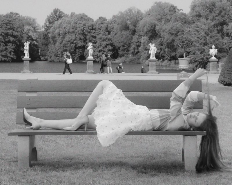 - La Pose Lánguida (Foto acostada en el banco): Esta foto es un estudio de líneas. Observa cómo el cuerpo está estirado, ocupando toda la banca. Las piernas extendidas alargan la figura, mientras el brazo levantado jugando con el cabello añade un toque de despreocupación y dinamismo.