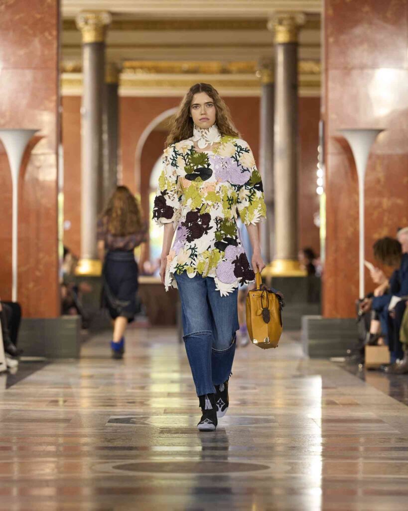 Lejos de los vestidos de gala imposibles, Masha desfiló con una propuesta radicalmente moderna: una blusa escultural con bordados florales en 3D combinada con unos jeans de corte recto. Es la definición perfecta del lujo relajado que Nicolas Ghesquière domina como nadie.